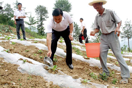 图为县长沈明云在万峪河乡谷场村村民张忠贤的烟叶田里为烟苗补水。