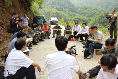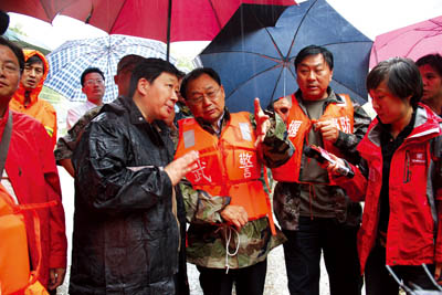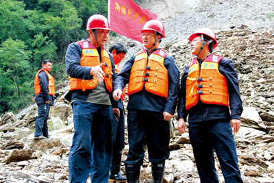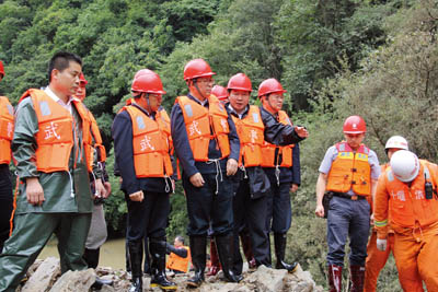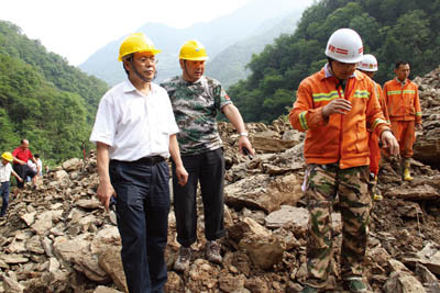 市委书记陈天会(中)、市长周霁(左一)在县长沈明云(右二)的陪同下,深入山体滑坡现场指导救灾。