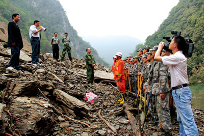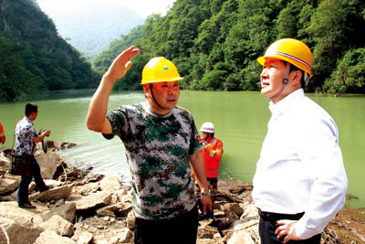 副市长张歌莺(左)、县长沈明云(中)在堰塞体现场指挥抢险救援工作。