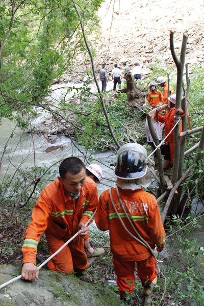 消防官兵砍树架桥到达事发现场