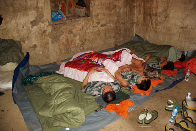 参加抢险的官兵打地铺休息。