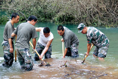 部队官兵涉水清理泄洪道。
