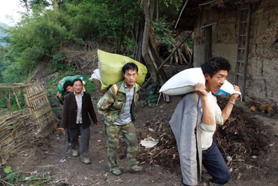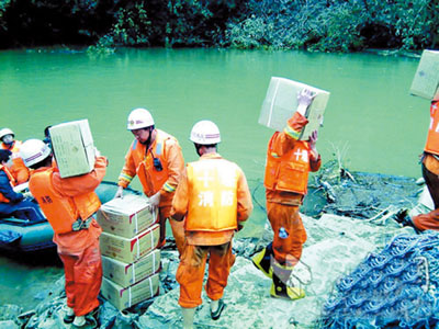 群众自发为救灾人员搬运后勤物资。