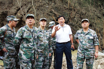 省委常委、省委秘书长李春明(中)在副市长张歌莺(右),县长沈明云(左)的陪同下现场指导山体滑坡救援。