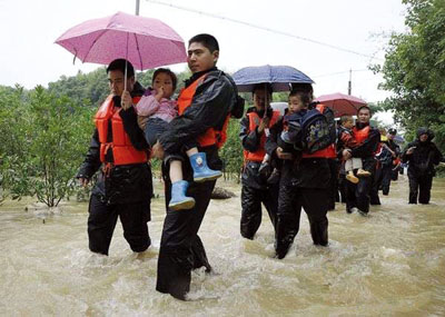 15时上午,救援人员冒雨淌水转移堰塞湖下游群众。
