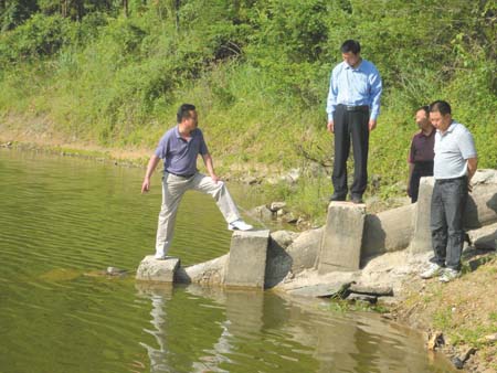 近日,强降雨天气连续出现,为切实做好防汛工作,中坝乡组织人员对水库、电站、引排水渠、在建工程、危房等进行全面突击检查,对地质灾害易发地段进行不定期巡查,及时排除发现的隐患,及时预警,严阵以待防大汛,以确保人民群众生命财产安全。图为检查罗佛宇水库场景。(赵晓双 摄)