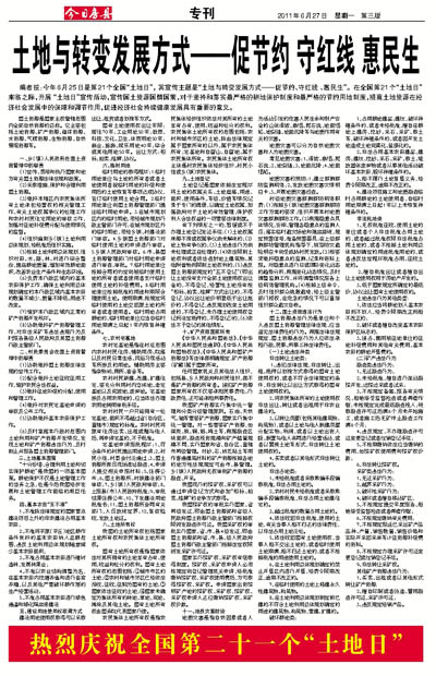编者按:今年6月25日是第21个全国“土地日”, 其宣传主题是“土地与转变发展方式——促节约、守红线 、惠民生”。在全国第21个“土地日”来临之际,开展 “土地日”宣传活动,宣传国土资源国情国策,对于坚持和落实最严格的耕地保护制度和最严格的节约用地制度,提高土地资源在经济社会发展中的保障和调节作用,促进经济社会持续健康发展具有重要的意义。