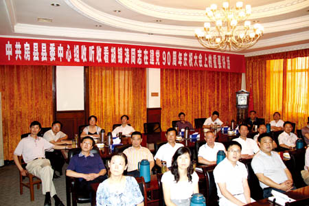 7月1日上午10时,庆祝中国共产党成立90周年大会在人民大会堂隆重召开。我县社会各界通过多种形式,集中收看了庆祝大会实况直播。张慧彬、戢逢尤、王启云、曹明权、李乃斌、聂承波、王家波、刘庆涛、徐锦凤、陈渊和在家的县四家班子领导在县委常委会议室集中收看庆祝建党90周年大会实况直播,认真聆听了中共中央总书记胡锦涛的重要讲话。 (吴宏强 摄)