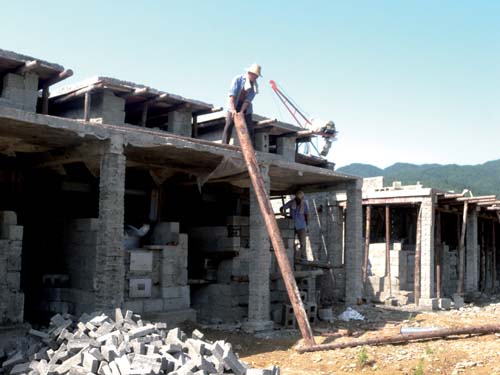 烤烟生产工作即将进入采摘烘烤阶段,中坝乡三溪沟烟叶基地的20连体密集型烤烟炉建设进入紧张阶段。为适应该基地烤烟需要,三溪沟村民加班加点力争在烟叶采摘之前建好烤烟炉。据悉,三溪沟基地20连体烤烟炉建成后一次能够完成300亩烟叶的烘烤工作,对进一步规范烟叶烘烤,实现提质提效,具有重大意义。图为施工现场。(赵晓双 摄)