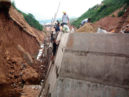 日前,在位于城关镇莲花村境内由十堰市双环公路建设有限公司承建的十房高速公路13标主线K139+606至K139+915段混凝土挡土墙施工现场,施工技术人员正忙碌着拆卸模板及对混凝土实施养生工作(如图),此举标志着该标段境内首个连片大体积混凝土挡土墙浇筑任务顺利完成,为后续工序的施工奠定了坚实基础。 (金伟忠 摄)