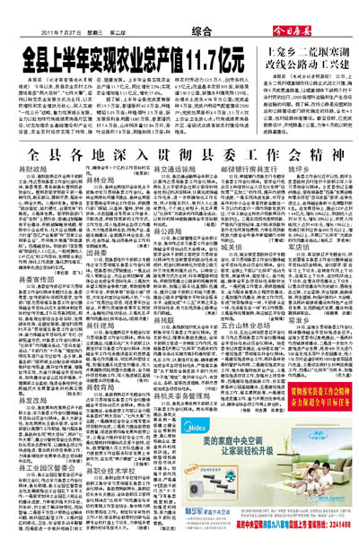 据了解,上半年全县完成夏粮面积19.7万亩,春播面积42.9万亩,种植糯稻5.05万亩;种植烟叶3.5万亩,新发展袋料食用菌1680万袋,春夏播药材7.4万亩,山羊饲养量52.84万只,茶叶总面积7.8万亩,栽植核桃2万亩;转移农村劳动力12.5万人,创劳务收入6.5亿元;改造基本农田505亩,新修渠道150.5公里,新建水利建筑物129处,治理水土流失4.98平方公里;完成造林9万亩,完成户用沼气配套建设2500户;完成抗旱面积6.9万亩,5.1万人饮上安全卫生放心水;竹房城镇带房县片区、省级试点镇等新农村建设快速推进。