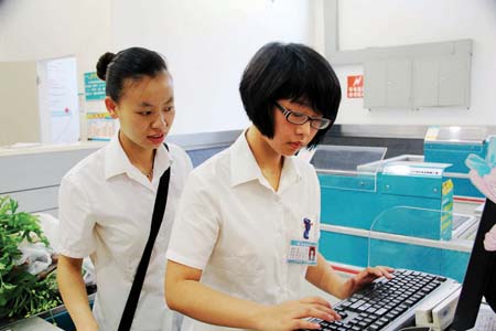 为帮助放假的学生渡过一个有意义的假期,积累更多的社会经验。今夏,寿康永乐生活广场为近20名学生提供了实践平台,为他们在超市的服务台、收银台、百货区、生鲜区等地安排了实践岗位。并为每位“小员工”安排专职老师,为他们进行岗前礼仪指导及岗位培训。成绩优秀的“小员工”,会在得到适当报酬的同时,进行一定的奖励。图为27日,刚刚高中毕业的女孩孟醒(右),在指导老师的帮助下,在收银台学习礼仪。(闻燃 王丽君 摄)