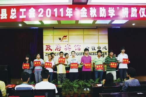 “金秋助学”是一项功在当代、利在千秋的社会公益事业,是实践“三个代表”重要思想的具体体现,也是为困难职工办实事办好事的民心工程。近几年来,为保证下岗、困难职工及农民工的子女不因贫困而辍学,让考上大学的贫困学子能按时入学,在县委、人大、政府、政协的关心支持下,全县各级工会组织充分发挥自身优势,积极开展“金秋助学”活动,并取得了可喜成绩。从2001年至今,全县累计筹集助学基金65.47万元,帮助730名困难职工子女圆了大学梦,已有398名学生完成了学业并走上了工作岗位。这些成绩的取得,离不开县委、县政府的关心,更离不开各级党政机关、企事业单位和富有爱心的社会各界人士的大力支持和无私奉献。参加“金秋助学”活动的各级党政机关、企事业单位和社会各界人士不图名、不图利,连续10年支持县总工会“金秋助学”活动,为贫困大学生慷慨解囊、奉献爱心,发扬中华民族扶危济困的传统美德,为莘莘学子铺设了成才之路,让困难家庭感受到了社会主义大家庭的温暖,为我县和谐的人文景象增添了新的光彩。
