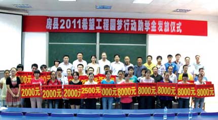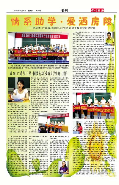 1日,由团县委、广电局、新闻中心联合开展的“情系助学·爱洒房陵” 2011希望工程圆梦行动助学金发放仪式在县一中举行。本次活动共筹集善款17.1万余元,68名贫困学子得到资助。