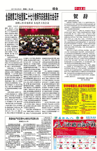 国运兴衰,系于教育;兴贤育德,责在师儒。当前,我县正处于新一轮加快发展的“黄金时期”。教育担负着培养人才、为推动经济社会发展提供智力支撑的重任。希望全县广大教师和教育工作者以科学发展观为指导,努力践行胡锦涛总书记提出的“爱岗敬业、关爱学生,刻苦钻研、严谨笃学,勇于创新、奋发进取,淡泊名利、志存高远”的希望,紧紧围绕我县“543”计划、“四大战略”、“两大目标、七件大事”,努力做人民满意的教师,创人民满意的学校,办人民满意的教育,为推动全县经济社会科学跨越发展做出新的更大贡献。