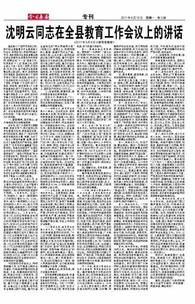 ——展望未来,教育事业发展大有可为。兴县必先兴教,今天的教育就是明天的经济。“十二五”时期,是房县加快发展、跨越发展的黄金时期,也是房县教育事业大有作为的关键时期。我们要以打造“全省山区教育强县”为目标,坚持“优先发展、改革创新、优质均衡、服务社会”的原则,突出教育均衡这一重点,办人民满意的教育;突出素质教育这一核心,育人民满意的人才;突出队伍建设这一根本,做人民满意的教师,全力推进房县教育事业大发展、大跨越。