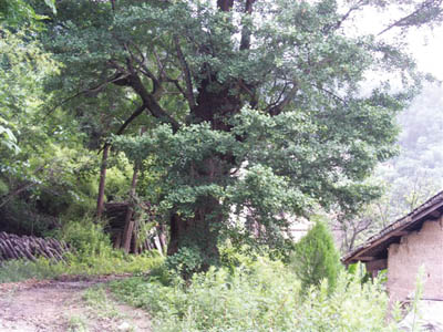 位于沙河乡朱家坪村有一棵白果树,不知哪朝哪代何人所植,据传树龄已是千年有余,树冠遮荫2亩左右,粗大的枝干已延伸到院子中央,两丈见方的天井院在夏天基本见不到太阳。上世纪60年代,因树洞内藏有大量的蜈蚣和蛇类动物,遭到雷击,大火连续燃烧七天七夜,将6米以上的树干化为灰烬,只留下半爿两尺多厚的空壳,被当地农人就地取材,围起来关牛,后来改建成猪圈。仅存的枯桩据传在当年又神奇的发芽生长,四十多年后的今天,枯桩上又是虬枝繁茂,遮荫近亩,年年果实累累。从基部长起来的子树直径已有五六十公分。初步估算树冠高约20多米,按照基部烧过的痕迹推算,古树的胸径约在3米左右。图为朱家坪的千年白果树。(《今日房县》论坛网友 砖头儿 摄)