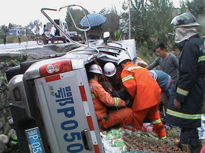 本报讯 18日,房县至神农架方向的公路上,一辆满载核桃的小货车发生侧翻,车内两人被困,县消防中队迅速出动,成功将被困人员救出。