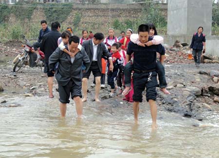 连日来绵绵秋雨导致我县马栏河水位上涨,为确保学生过河安全,青峰小学组织教师每天在马栏河白马沟段,护送学生安全上下学。图为教师背着学生过河的情景。(杜元江 摄)