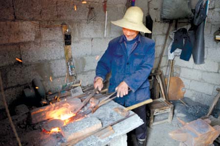 图为曾老汉正在打铁。