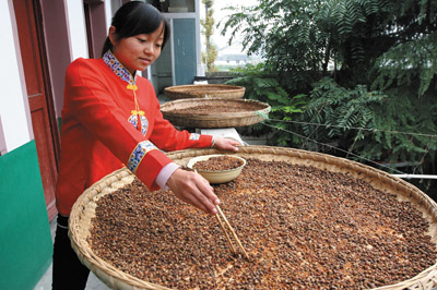 20日,军店镇龙家湾农民马仪霞在晾晒用黄豆制作的臭豆。在我县,家家户户有制作臭豆的传统。臭豆制作方法简单,先将黄豆洗净,用凉水泡胀后,用大火将黄豆煮熟,并捞出放凉,晾晒两至三天,待黄豆发热发粘时,加调料再放五至七天,闻着臭、吃着香的臭豆就做成了。(张启龙 余梅 摄)