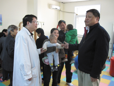为进一步了解2011年全县0-6岁贫困残疾儿童康复工程受助残疾儿童的现状及康复成效。近日,县残联理事长 散启先一行四人前往十堰市东风公司花果医院,对正在接受康复治疗的15名0-6岁贫困残疾儿童进行跟踪回访,鼓励残疾儿童家长要增强信心,配合治疗,精心陪护,并为每位家庭送上200元慰问金。图为回访现场。 (许旭 摄)