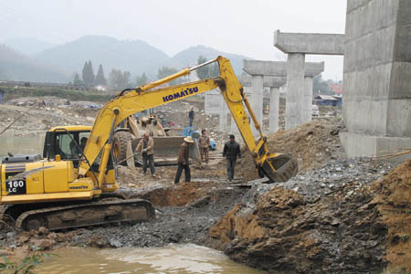 1日,青峰镇青万大桥施工现场一片繁忙景象。入秋以来,青峰镇围绕安全饮水,交通建设,粮油生产,林业生产等方面全面推进秋冬农业开发进程。目前峪坪河、中堰河、刘家河、花园4个村安全饮水工程正加紧实施;青万大桥引线1.5公里,白龙池公路硬化5.1公里正在修建之中;全镇播种小麦1.6万亩,油菜1.2万亩 ,积极进行土地流转,预留烟叶基地6000亩;500亩的核桃基地已落实到地块。 (赵爱平 桂涛 摄)