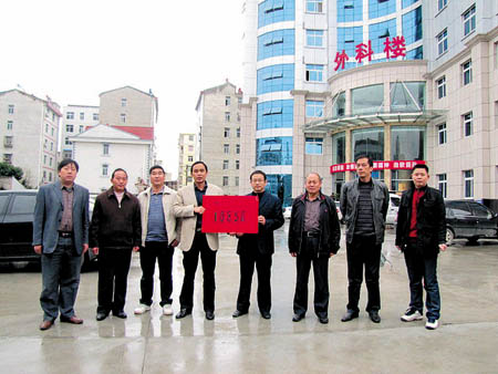 7日,县实验中学校长李儒军将10850元教职工捐款交到该校教师谢勇手中。帮助谢勇老师身患重病的妻子治病。图为捐赠现场。(曹刚 摄)