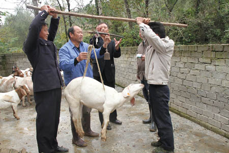 8日,红塔镇沙坪村羊农曾永昌家把6只山羊过秤卖给了上门收购的老板,一次性获得收入4000多元。今年曾永昌已先后出售山羊23只,获利3万多元,目前还有20多只山羊存栏。近年来,红塔镇大力发展山羊产业,去年8月份,该镇在沙坪村建立“1235养羊科技示范户”16户。今年,16户科技示范户山羊存栏量达1486只,出售863只,实现销售收入56.8万元,户平收入近4万元。 (桂涛 摄)
