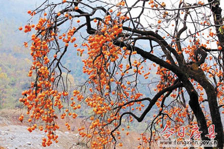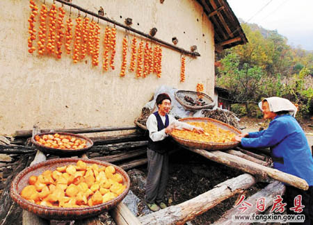 深秋时节,我县乡村柿子成熟,漫山遍野黄里透红的柿子像一只只“小灯笼”挂满枝头,仿佛在向人们诉说着丰收的喜悦。当地农户将柿子采摘下来后,穿成串挂在屋檐下或放在簸箩里晾晒,制作柿饼,形成一道丰收的秋天景象。 (张华田 摄)
