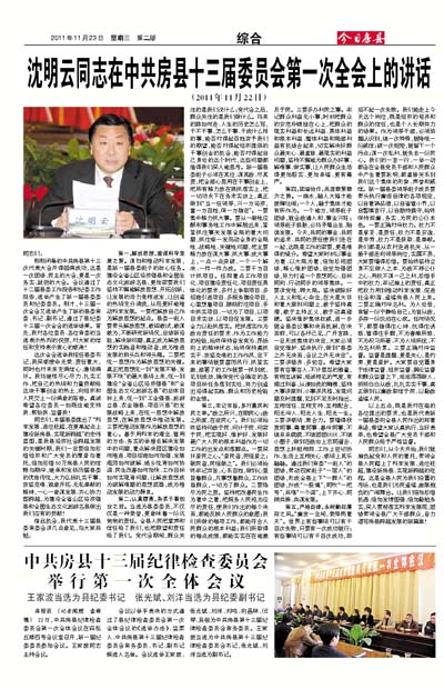 刚刚闭幕的中共房县第十三次代表大会开得圆满成功,这是一次团结、民主的大会,更是一次务实、鼓劲的大会。会议通过了十二届县委工作报告和纪委工作报告,选举产生了新一届县委委员和纪委委员。刚才,十三届一次全会又选举产生了新的县委常委、书记、副书记,通过了县纪委十三届一次全会的选举结果。首先,我对各位委员、各位常委的当选表示热烈的祝贺,对大家的信任和支持表示衷心的感谢!