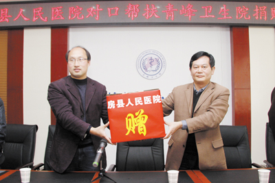 18日,县人民医院院长车向前将价值近万元的医疗教学设备和4千元的药品赠于青峰镇卫生院,并与该卫生院签定对口支援帮扶协议书。县人民医院将在两年内对口支援青峰镇卫生院,派驻中高级职称的医务人员,帮扶该院开展常见病、多发病的诊疗服务;组织业务查房、手术示教、病例讨论等形式开展临床教学和技术培训帮助其提高业务水平;围绕医疗核心制度指导其业务制度建设,规范内部管理,完善整体功能,提高卫生院管理水平。(裴中东 摄)