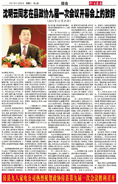 正当全县上下深入学习县十三次党代会精神之际,我们迎来了政协房县九届一次会议的隆重开幕!这次会议的主要任务是:全面总结八届政协工作成绩,研究确定未来五年工作任务,选举产生新一届政协领导班子。开好这次会议,对于进一步统一思想,凝聚力量,科学发展,进位赶超,具有十分重要的意义。首先,我代表县委,向大会的召开表示热烈的祝贺!向出席会议的全体委员和同志们表示亲切的问候!
