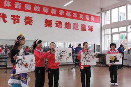 11月26日,“房县‘十校’中小学体音美教师教学基本功竞赛”在实验小学顺利举行。竞赛包括:演讲、理论测试、广播体操、各专业项目、个人才艺展示等20余项,共有40名教师参赛。 图为比赛现场。 (方诗军 摄)