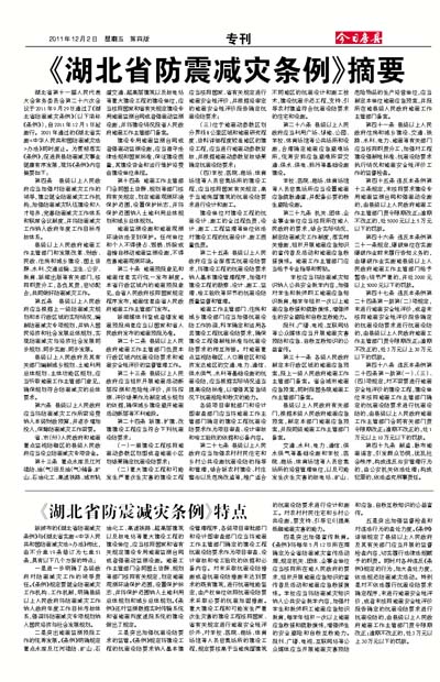 湖北省第十一届人民代表大会常务委员会第二十六次会议于2011年9月29日通过了《湖北省防震减灾条例》(以下简称《条例》),自2011年12月1日起施行。2001年通过的《湖北省实施<中华人民共和国防震减灾法>办法》同时废止。为贯彻落实《条例》,促进我县防震减灾事业健康有序发展,现将《条例》内容摘要如下: