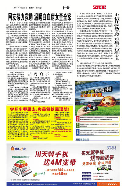 本报讯 (通讯员余国金) 近日,在湖南长沙湘雅医院血液科58病室,正在喂女儿田欣梦吃饭的杨旭平手机 “嘀”的一声响,她拿起手机一看,一个陌生手机号发来的短信让杨旭平感动不已。 “房县网友为田欣梦捐助的首笔6900余元款已汇入你的账户,请查收……”这无疑是女儿田欣梦生病以来让她感到最振奋的消息。