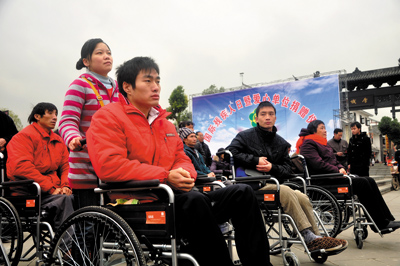 近日,“隐身女孩”杨家群推着雷泽军在唐城广场爱心单位捐赠仪式上获赠一副崭新的轮椅。襄阳老河口市女孩杨家群“隐身”照顾房县网友雷泽军的故事经本报首发后,引起社会广泛关注。当日,县残疾人联合会组织爱心单位为残疾人募捐,获知雷泽军四处奔波录节目、求医,轮椅已损坏不能继续使用后,赠送给雷泽军一副崭新的轮椅。图为捐赠现场。