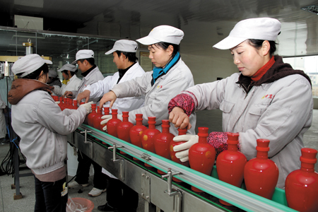 5日上午,房县兴祥黄酒有限公司工人正在赶制“神农皇”黄酒,准备运往中南海。该公司自2009年落户房县后,结合现代科技,升级传统工艺,酿制成稻香浓郁、酒味甘爽的“神农皇”黄酒。现已研制出神农皇贵妃淡酒、神州骄子酒、天下宴黄酒等6个系列酒。据了解,目前该公司年可生产风味黄酒1.2万吨,年产值可突破7亿元。 (赵爱平 任琦 党天成 摄)