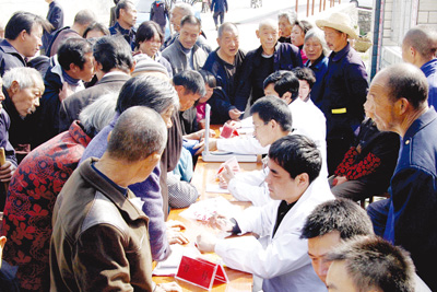 图为县人民医院“三万”工作组在门古寺镇狮子岩村义诊。