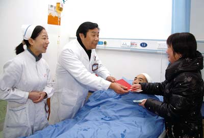 日前,县人民医院党办主任杨太权将神经外科病人周某送给该科主任李德龙及管床医师的2200元红包退还。近年来,县人民医院着力改造医疗环境,提高医疗技术,积极改善服务态度,努力和谐医患关系,并扎实开展“三好一满意”和“治庸问责”两项活动,群众满意率不断上升。截止12月,该医院共退还病人红包2万余元,收到锦旗感谢信18面(封),病人满意度保持在95%以上。 (裴中东 摄)