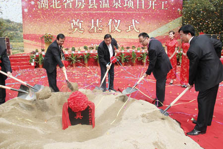 2011年9月26日,房县温泉开发项目开工奠基仪式在原温泉度假村隆重举行。据了解,房县温泉开发项目总投资6亿元,占地1300亩,该项目建成运营后,将成为集生态旅游、休闲 度假、商务会议、温泉保健、运动休闲等多功能于一体的生态化、情景化5A级温泉旅游度假区,成为鄂西生态文化旅游圈上的休闲度假胜地,成为“一江两山”黄金旅游线上的一颗耀眼明珠。