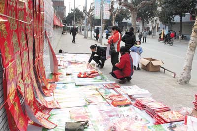 “虎跃龙腾欢盛世,莺歌燕舞贺新春”。5日,记者在县一中门口看到,出售春联的摊位前挂满了一幅幅充满龙年气息的春联,前来挑选的人络绎不绝。春节临近,家家户户都忙着购买春联,一副小小的春联,寄托了人们对新年的美好愿望。 (邓伟 桂涛 摄)