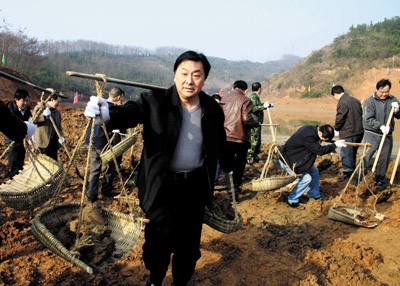 2011年12月14日,我县“万名干部进万村挖万塘”活动动员大会召开,这项活动是巩固和发展“三万”活动成果,促进农民增收、农业增效、农村发展的迫切需要,是进一步转变机关干部作风,做好新形势下群众工作的迫切需要。这次活动我县计划从2011年12月开始,集中三个月时间,整治塘堰1500口以上。图为县委书记沈明云、县长朱光洪正在参加劳动。