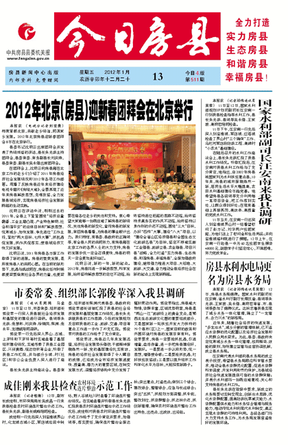 2012年北京(房县)迎新春团拜会在北京举行国家水利部副司长汪安南来我县调研房县水利水电局更名为房县水务局市委常委、组织部长郭俊苹深入我县调研成佳刚来我县检查农村环境连片整治示范工作