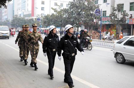 为确保春节期间全县社会治安稳定,县公安局从1月9日至21日,在全县范围内开展为期2周的集中巡逻防控行动。行动中,县公安局将城区划分为6个重点区域,白天从局直各单位抽调12名民警分成6组,晚上由机动大队和城关派出所组织民警带领专职巡逻队员,采取白天徒步巡逻和夜间设卡盘查的方式,对重点部位实行24小时全天候巡逻管控;在各乡镇,由乡镇派出所组织群防力量开展巡逻,全力维护全县社会政治稳定和治安安定。图为公安干警在城区巡逻。 (汪莹 摄)
