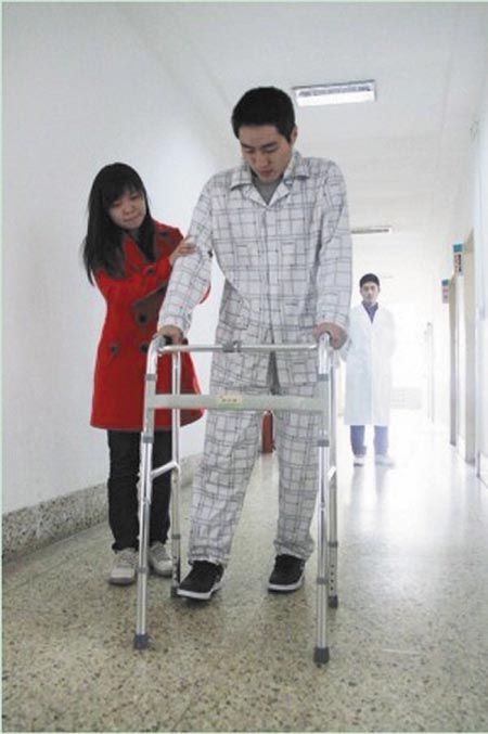 “他都瘫痪这么久了,我真的不敢想象他还能站起来……”11日,远在山东的杨家群给记者打来电话,喜极而泣地说,“雷泽军经过山东省红十字会介入医院的治疗,可以在器材的辅助下站立,并可以迈步行走了。”