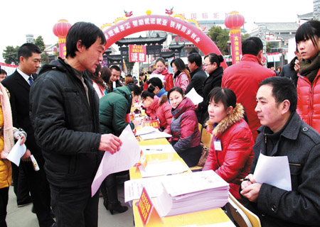 喜迎十八大,争创新业绩。1月30日,县人社局、县总工会等联合举办“返乡农民工专场招聘会”。当日,80多个企业现场发放各类宣传资料2.5万多份,提供就业岗位11000多个,现场达成就业意向2200人。(赵爱平 唐波 摄)
