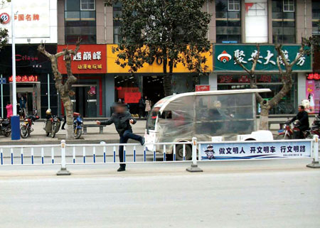 为使道路交通安全、有序,我县在主要交通路段安装了护栏、路灯、监控等公共设施,但笔者近日发现,一些市民为抄近路,竟然不愿意多走几步,频频上演翻栏杆过马路的惊险动作,这种行为不仅有损城市形象,而且极易发生交通事故。笔者提醒广大市民为了自身和他人的安全,不要随意翻越栏杆。 (亦文 摄)