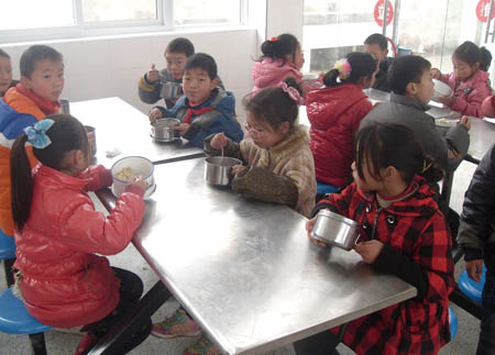 近日,门古寺镇秦口小学的食堂正式投入使用,孩子们在干净明亮的食堂中就餐显得格外开心(如图)