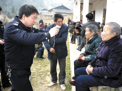 连日来,姚坪乡派出所所长徐永宏和同事们带着照相机等设备,深入全乡16个行政村,上门为年迈老人、残疾人、留守妇女补办第二代身份证500余人次,深受群众好评。图为该所干警正在肖家沟村为年迈老人照相补办第二代身份证。(柯勇 摄)